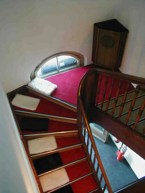 Im Treppenhaus zum Obergeschoss befand sich das Treppenklavier. Jeweils die Hälfte einer Treppenstufe wurde mit einer druckempfindlichen Fläche versehen. Die druckempfindlichen Flächen waren in Stoff verpackt und farblich so angeordnet, dass sie einer Oktave einer Klaviertastatur mit dessen Anordnung von Ganz- und Halbtönen entsprachen. Mit dem Fuss konnte man die Tasten spielen. Die Aufgabe der Spieler bestand darin, eine vom Computer generierte Tonfolge nachzuspielen. Die Töne mussten in ihrer Reihenfolge nachgespielt werden. Dabei war es jedoch egal wie viele Fehler der Spieler machte. War der erste Ton gefunden wartete das System auf den zweiten Ton egal wieviele falsche Töne ausgelöst wurden. Die erste Tonfolge bestand jeweils aus drei verschiedenen Tönen, die nächste aus vier, dann fünf und als letztes eine Sechstonreihe. Hatte der Spieler die Geduld, alle vier Tonfolgen korrekt nachzuspielen, durfte er anschliessend zur Belohnung eine eigene kurze Melodie einspielen, die dann solange vom Computer gespielt wurde, bis ein nächster Spieler auf eine der Klaviertasten stand und somit ein neues Spiel, eine neue Dreitonfolge startete.