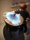 Der Klangtisch ist ein interaktives Bild. Unserer Zivilisation als Fotocollage. Unter dem Fotobild sind acht lichtempfindliche Sensoren in die Tischplatte eingelassen. Der Tisch wird von oben mit einer starken Lichtquelle beleuchtet. Durch den Schatten einer Hand oder des Körpers der Besucher verändern die Sensoren ihren elektrischen Widerstand. Zu hören gibt es, was auf dem Bild zu sehen ist. Die acht Zonen sind: Stadt, Industriegebiet, zwei verschiedene ländliche Landschaften, alpine Landschaft, eine asiatische Berglandschaft, Meeresküste und eine Raumstation. |