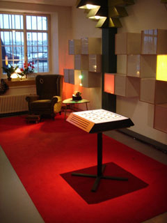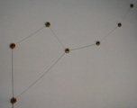 Wie Klingen die Sterne? Wir wissen es. Sieben lichtempfindliche Sensoren, als Sterne getarnt, hängen an der Wand in der Formation des Grossen Wagens. Gegenüber der Wand im Abstand von einigen Metern steht ein Stuhl mit zwei Laserpointern. Werden die Sterne mit den Laserstrahlen beleuchtet modulieren sie ein Soundfile. Bei sieben Sternen gibt es 2 hoch 7, also 128 verschiedene Kombinationsmöglichkeiten. |