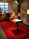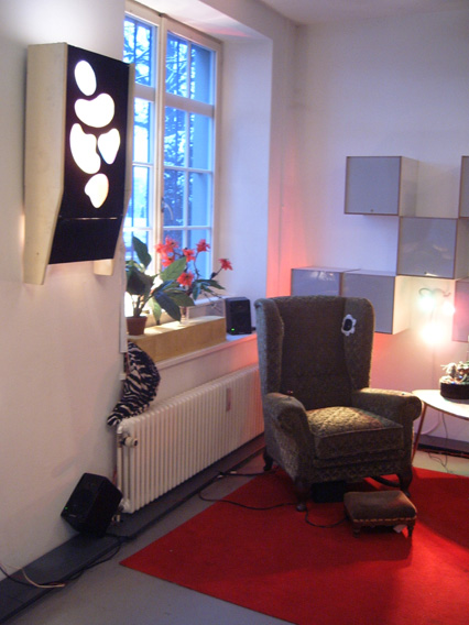 Setz dich in den Sessel und lausche. Nähere dich den Blumen und lausche. Eine Wohnzimmersituation mit einem gemütlichen Ohrensessel und Zimmerpflanzen. Die Zimmerpflanzen sind mit Antennen von Theremins versehen und reagieren auf die Nähe von Menschen mit sphärischen Klängen. Die Sitzfläche des Sessels erkennt, ob jemand in ihm sitzt und fängt ebenfalls an, den Besucher mit Musik zu verwöhnen. Einzig der Fussschemel mag es nicht, wenn man seine Füsse auf ihm abstütz und zeigt dies durch Grummeln und Fauchen. |